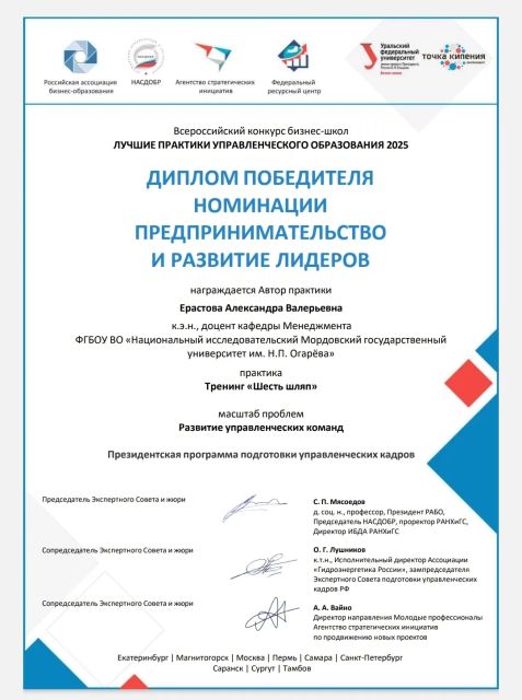 Доцент кафедры менеджмента, к.э.н. Ерастова Александра Валерьевна получила диплом победителя в номинации «Предпринимательство и развитие лидеров» в форуме лучших практик управленческого образования